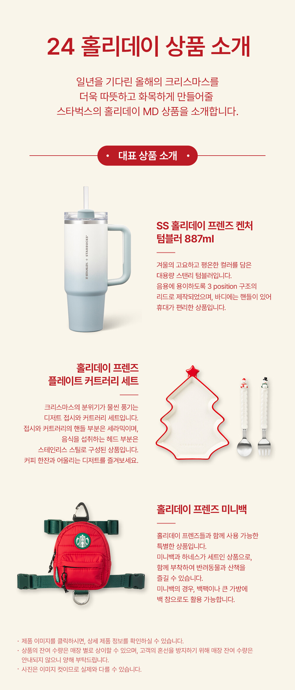 홀리데이 텀블러와 커트러리 세트, 미니백과 하네스를 판매하고 있네요! 반려동물 용품이 나온게 조금 눈여겨 볼 점인 거 같고 선물로도 좋아보입니다.😍