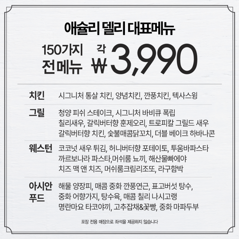 대중들에게 가성비 뷔페로 잘 알려진 애슐리의 메뉴 150여 종을 3,990원에 판매하고 있는 애슐리델리