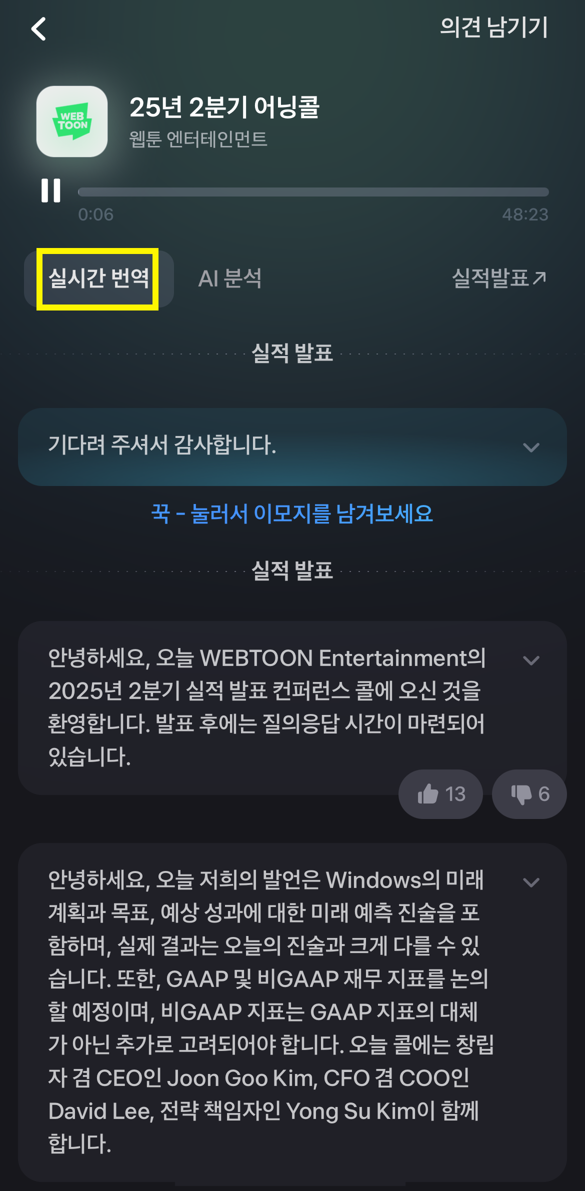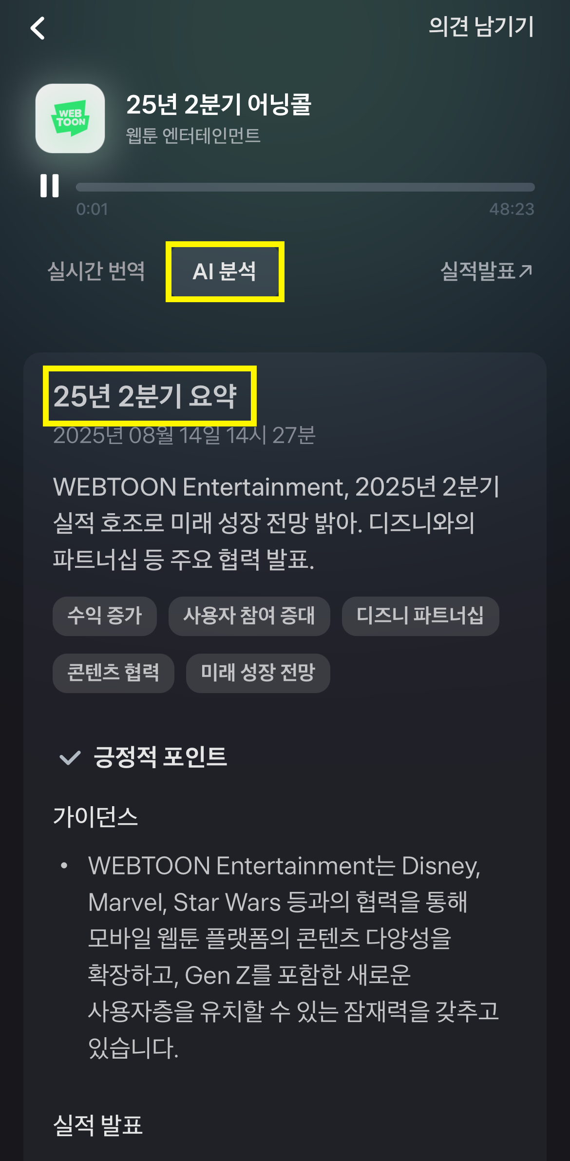 • 발표 시간에 맞춰 토스증권 어닝콜 기능으로 경영진 발언을 실시간으로 듣습니다.