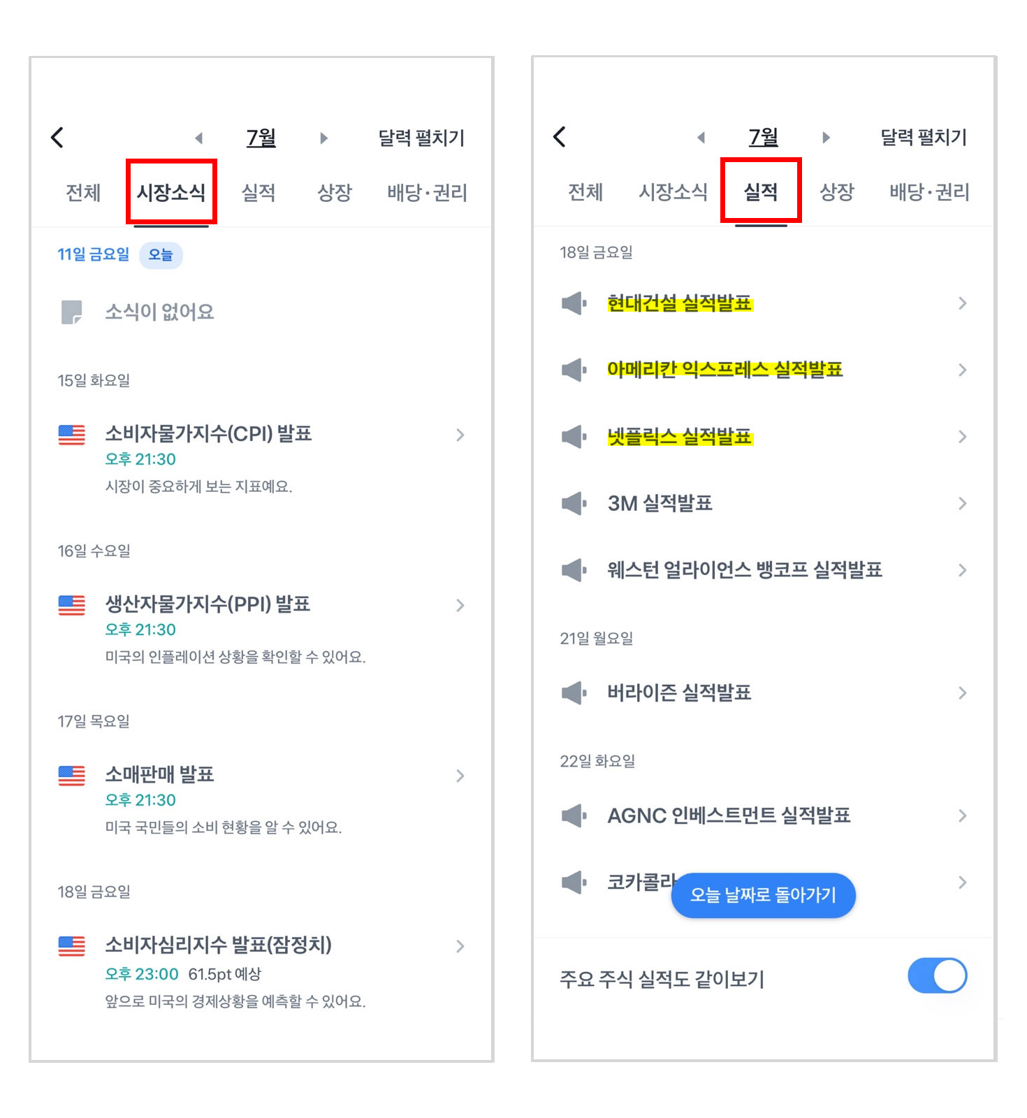 • 실적 : 기업들의 실적발표 일정을 확인 할 수 있어요.