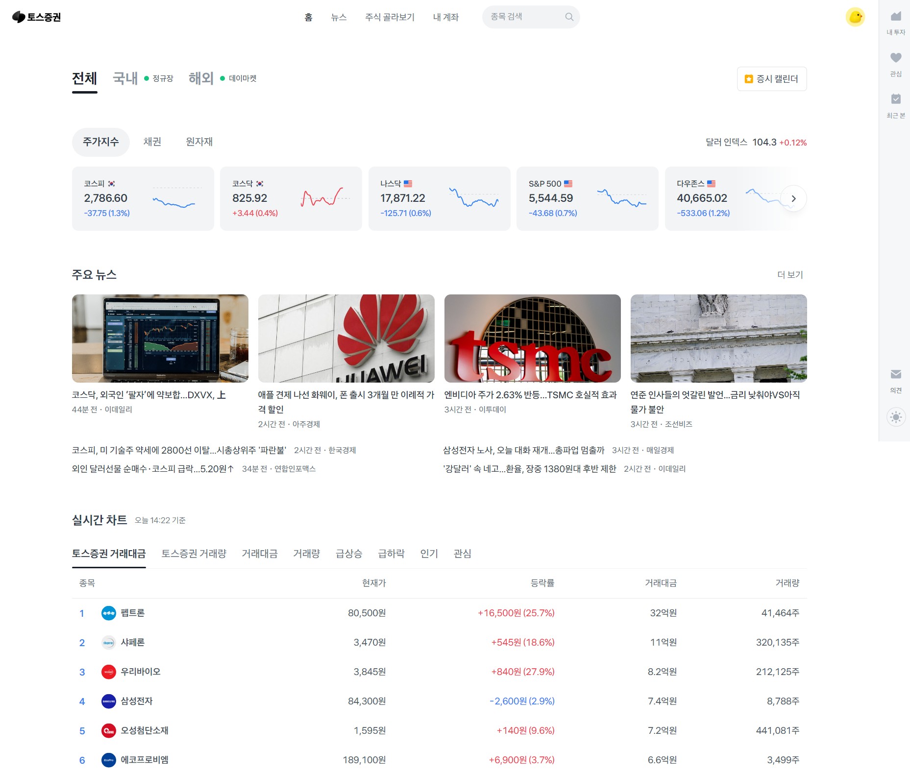토스 특유의 깔끔하고 직관적인 인터페이스가 돋보이는 토스 증권 PC 버전입니다.