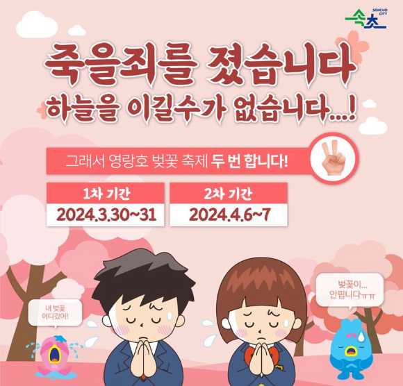 이에 이달 30~31일 예정됐던 '2024 영랑호 벚꽃 축제'를 다음달 4월 6~7일 한 번 더 연다고 밝혔다.